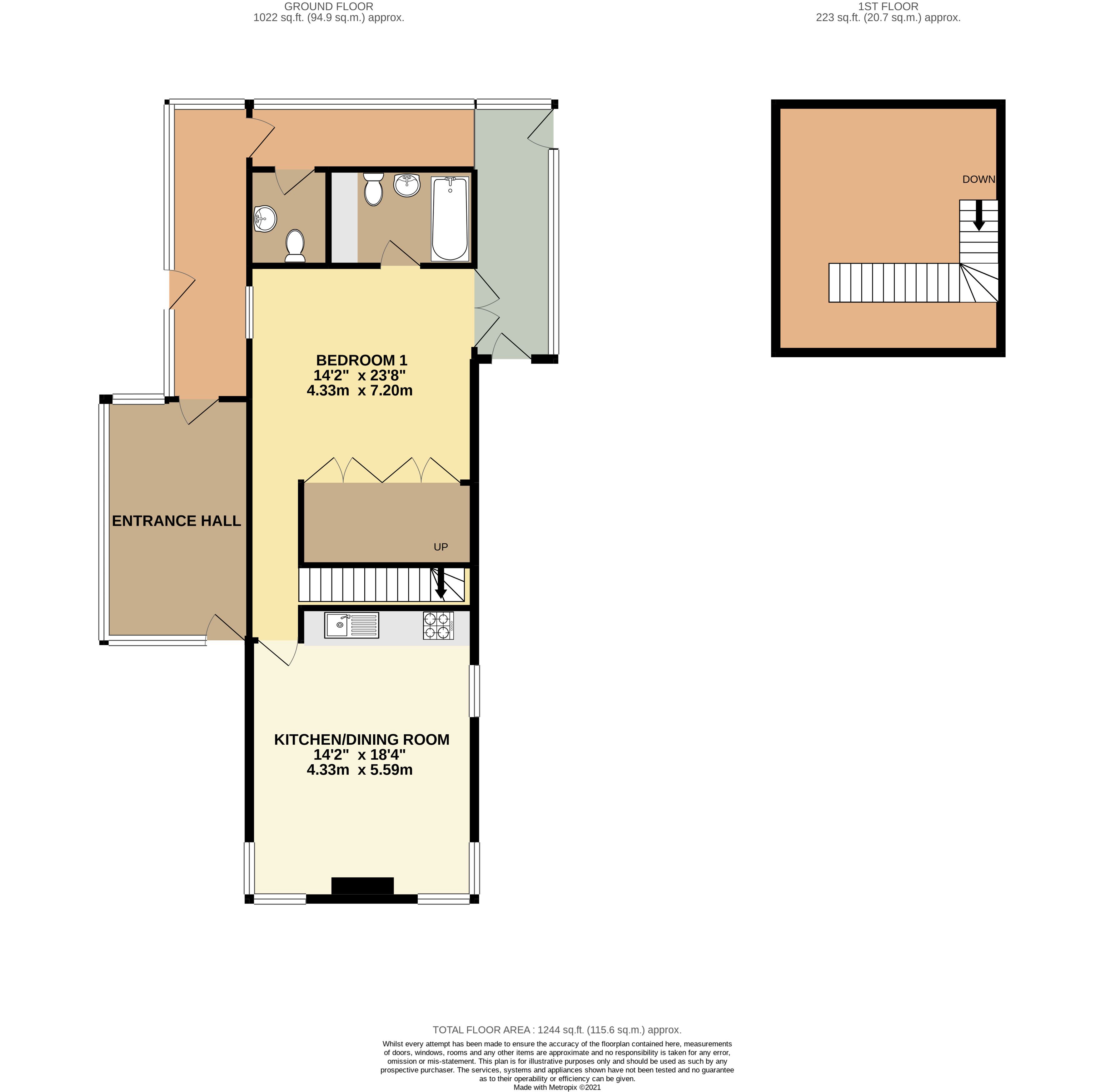 On a floor 115 sq. m (1244 sq. ft) the accommodation includes an open plan kitchen, dining, living room, bedroom, bathroom, guest WC, surrounding glass walk way and a mezzanine floor which could be used for an additional bedroom.